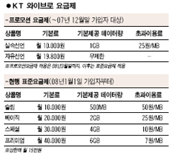 µû¶ó¼ KT´Â Á¤¾×Á¦ ¶Ç´Â ½Ã°£Á¦ Á¤¾×Á¦¸¦ ½Ç½ÃÇÒ °æ¿ì ¾ÆÁ÷ ÀÚ¸®¸¦ ÀâÁö ¸øÇϰí ÀÖ´Â ¿ÍÀ̺ê·Î »ç¾÷¿¡ ÈûÀ» ºÒ¾î³Ö¾î Áú ¼ö ÀÖÀ» °ÍÀ¸·Î ±â´ëÇϰí ÀÖ´Ù. Áö³ 7¿ù¸» ÇöÀç KTÀÇ ¿ÍÀ̺ê·Î °¡ÀÔÀÚ´Â ºÒ°ú 3¸¸¸í ¼±À¸·Î ¿¬¸» ¸ñǥġ 20¸¸¸í¿¡ Å©°Ô ¸ø ¹ÌÄ¡°í ÀÖ´Â ½ÇÁ¤ÀÌ´Ù.
