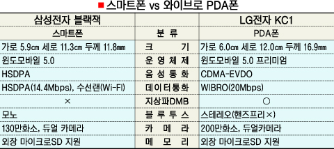 ¡®½º¸¶Æ®Æù »ì±î, PDAÆù »ì±î.¡¯°í¼ÓÀ¸·Î ¹«¼±µ¥ÀÌÅÍ ¼­ºñ½º¸¦ ÀÌ¿ëÇÒ ¼ö ÀÖ´Â HSDPA(°í¼ÓÇÏÇâÆÐŶÁ¢¼Ó)¿Í ¿ÍÀ̺ê·Î µî 3.5¼¼´ë °í¼Ó³×Æ®¿öÅ© ½Ã´ë°¡ ¿­¸®¸é¼­ º°µµ ¿î¿µÃ¼Á¦¸¦ žÀçÇÑ °í¼º´É ´Ù±â´ÉÆùÀÌ ÀÕµû¶ó Ãâ½ÃµÇ°í ÀÖ´Ù. ƯÈ÷ ¾ÖÇÃÀÇ ¡®¾ÆÀÌÆù¡¯ÀÌ µ¹Ç³À» ÀÏÀ¸Å°¸é¼­ ±¹³»¿¡¼­ ¿Ü¸é¹Þ´ø ½º¸¶Æ®Æù, PDAÆù¿¡ ´ëÇÑ °ü½ÉÀÌ ´õ ³ô¾ÆÁö°í ÀÖ´Ù.½º¸¶Æ®ÆùÀÌ ÈÞ´ëÀüÈ­¿¡ PDA ±â´ÉÀ» Ãß°¡Çß´Ù¸é PDAÆùÀº PDA¿¡ À̵¿Åë½Å ¸ðµâÀ» Áý¾î ³Ö¾î ÀüÈ­ ±â´ÉÀ» ±¸ÇöÇÑ °ÍÀÌ´Ù. ÃÖ±Ù Ãâ½ÃµÈ »ï¼ºÀüÀÚÀÇ ½º¸¶Æ®Æù ¡®¿ïÆ®¶ó¸Þ½Ã¡¡¯(ÀÏ¸í ¡®ºí·¢À衯)°ú LGÀüÀÚÀÇ ¿ÍÀ̺ê·ÎÆù ¡®KC1¡¯À» Á÷Á¢ ½áºÃ´Ù.