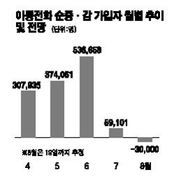 27ÀÏ °ü·Ã¾÷°è¿¡ µû¸£¸é ÀÌ´Þ µé¾î 19ÀϱîÁö SKÅÚ·¹ÄÞ°ú KTF, LGÅÚ·¹ÄÞ µî ÀÌÅë 3»çÀÇ ÃÑ °¡ÀÔÀÚ¼ö´Â 7¿ù¸»¿¡ ºñÇØ 3¸¸¸í ÀÌ»ó °¨¼ÒÇÑ °ÍÀ¸·Î ÃßÁ¤µÈ´Ù. ¸¸¾à ÀÌ·¯ÇÑ Ãß¼¼°¡ °è¼ÓµÈ´Ù¸é Áö³ 2005³â ÀÌÈÄ Ã³À½À¸·Î ¼ø°¨¼ÒÀ» ±â·ÏÇÏ°Ô µÈ´Ù. À̵¿ÀüÈ °¡ÀÔÀÚ¼ö´Â ¿Ãµé¾î ¿ùÆò±Õ 30¸¸~50¸¸¸íÀ» À¯ÁöÇÏ´Ù°¡ Áö³ 7¿ù 5¸¸¸í¼±À¸·Î ¶Ò ¶³¾îÁ³´Ù.
