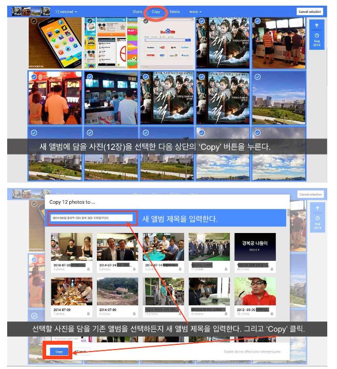 ±×·³, ¾Ù¹üÀ» ¾î¶»°Ô ¸¸µå³ª? ¡®ÃÖ±Ù Ãß°¡µÈ »çÁø(recently added)¡¯ ¸Þ´º¿¡¼­ ÇÑ ¾Ù¹ü¿¡ ´ã°í ½ÍÀº »çÁøÀ» ÁöÁ¤ÇÑ ´ÙÀ½ »ó´ÜÀÇ ¡®Copy¡¯ ¹öưÀ» ´©¸£¸é ±âÁ¸ ¾Ù¹üÀÌ ¶á´Ù. ±âÁ¸ ¾Ù¹ü¿¡ ´ã°í ½ÍÀ¸¸é ¼±ÅÃÇÏ¸é µÇ°í, »õ ¾Ù¹üÀ» ¸¸µé°í ½ÍÀ¸¸é ¾Ù¹ü À̸§À» ÀÔ·ÂÇÏ¸é µÈ´Ù. ¾Ù¹ü À̸§ ÀÔ·ÂÀÌ ³¡³ª¸é ¿ÞÂÊ ¹Ø¿¡ ÀÖ´Â ¡®Copy¡¯ ¹öưÀ» ´©¸£¸é µÈ´Ù.