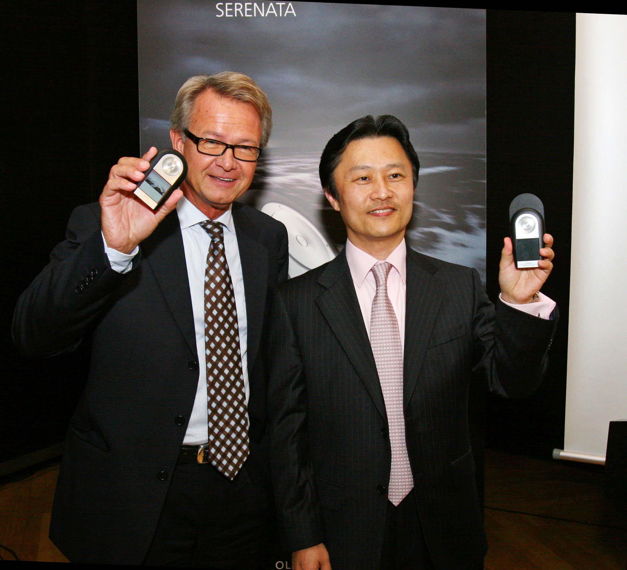 ÇöÁö½Ã°£ 1ÀÏ, º£¸¦¸° ÇÏ¾æÆ® È£ÅÚ¿¡¼ ÀÖ¾ú´ø ÇÁ¸®¹Ì¾ö ¹ÂÁ÷Æù £§¼¼·¹³ªÅ¸£§(SGH-F310) ¹ßÇ¥ ±âÀÚȸ°ßÀå¿¡¼ ¹ð¾Ø¿Ã·ì½¼ CEO Åç¹ø ¼Ò·»½¼(Torben Ballegaard Sorensen)¿Í »ï¼ºÀüÀÚ Á¤º¸Åë½ÅÃѰý Áö¿µÁ¶ Àü¹«°¡ ¾ç»çÀÇ µÎ¹øÂ° ÇÕÀÛǰÀÎ £§¼¼·¹³ªÅ¸£§¸¦ µé°í »çÀÌÁÁ°Ô ¿ôÀ½Áþ°í ÀÖ´Ù. »ï¼ºÀüÀÚ¿Í µ§¸¶Å©ÀÇ ¿Àµð¿À ¾÷üÀÎ ¹ð¾Ø¿Ã·ì½¼(B&O)ÀÌ 1ÀÏ(ÇöÁö½Ã°£) µ¶ÀÏ º£¸¦¸° ÇÏ¾æÆ® È£ÅÚ¿¡¼ ±âÀÚȸ°ßÀ» °®°í ¾ç»ç°¡ °øµ¿ °³¹ßÇÑ ÇÁ¸®¹Ì¾ö ¹ÂÁ÷Æù `¼¼·¹³ªÅ¸(Serenata, SGH-F310)£§¸¦ °ø°³Çß´Ù.
