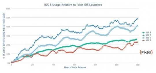 ÀÌ ¼öÄ¡´Â Áö³ÁÖ ¹ßÇ¥µÈ Ãʱâ iOS8 ä¿ë·ü 15%¿¡ ºñÇØ °ÅÀÇ ¹è°¡ »ó½ÂÇÑ °ÍÀÌ´Ù. ÇÏÁö¸¸ ÀÛ³â iOS7ÀÇ ¹èÆ÷ ÈÄ °°Àº ±â°£ µ¿¾ÈÀÇ Ã¤¿ë·ü 50%º¸´Ù´Â Å©°Ô ³·Àº °ÍÀÌ´Ù. ¾ÖÇÃÀº ¾ÆÁ÷ iOS8 ä¿ë·üÀ» °ø½ÄÀûÀ¸·Î ¹ßÇ¥ÇÏÁö ¾Ê¾Ò´Ù.