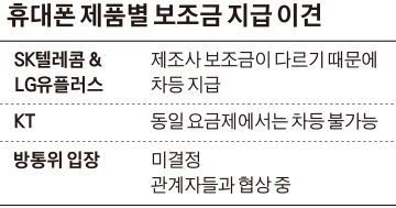 ¹ý¿¡ ÀÌ ºÎºÐÀÌ ¸íÈ®ÇÏÁö ¾Ê¾Æ ÀÌÅë»ç¸¶´Ù ´Ù¸¥ ÇØ¼®À» Çϰí ÀÖ´Ù. SKÅÚ·¹ÄÞ°ú LGÀ¯Ç÷¯½º´Â Á¦Ç°º°·Î Â÷À̸¦ µÑ ¼ö ÀÖ´Ù°í ÁÖÀåÇϰí ÀÖ°í, KT´Â Â÷À̸¦ µÑ ¼ö ¾ø´Ù´Â ÂÊÀÌ´Ù. SKÅÚ·¹ÄÞ°ú LGÀ¯Ç÷¯½º´Â ´ÙÀ½´Þ 1ÀϺÎÅÍ °ø½ÃÇÏ´Â º¸Á¶±Ý ÃѾ×ÀÌ ÀÌÅë»ç¿Í Á¦Á¶»ç°¡ °¢°¢ ÁÖ´Â º¸Á¶±ÝÀÌ ÇÕÃÄ °ø°³µÇ´Â ¸¸Å­, Á¦Á¶»ç¿¡¼­ ÁÖ´Â º¸Á¶±Ý ¾×¼öÀÇ Â÷ÀÌ¿¡ µû¶ó ÃѺ¸Á¶±ÝÀÌ ´Þ¶óÁ®¾ß ÇÑ´Ù°í ÁÖÀåÇÑ´Ù. Â÷º° Çã¿ëÀ» ÁÖÀåÇÏ´Â Åë½Å¾÷ü ÀÓ¿øÀº ¡°Á¦Á¶»ç¸¶´Ù º¸Á¶±Ý Áö±Þ¾×ÀÌ ´Ù¸£°í ½ÉÁö¾î ¾ÖÇÃÀº 1¿øµµ ÁÖÁö ¾Ê´Âµ¥, °°Àº ¿ä±Ý´ë¿¡´Â ¹«Á¶°Ç µ¿ÀÏÇÏ°Ô º¸Á¶±ÝÀ» ÁÖ¸é °á±¹ ÀÌÅë»ç°¡ ³ª¸ÓÁö¸¦ ºÎ´ãÇ϶ó´Â °ÍÀ̾ ¸»ÀÌ µÇÁö ¾Ê´Â´Ù¡±¸ç ¡°Á¦Á¶»ç°¡ ÁÖ´Â º¸Á¶±Ý¿¡ ¸ÂÃç ÈÞ´ëÆù ¸¶´Ù º¸Á¶±ÝÀ» Â÷µî Áö±ÞÇÒ ¼ö ÀÖ¾î¾ß ÇÑ´Ù¡±°í ¸»Çß´Ù.