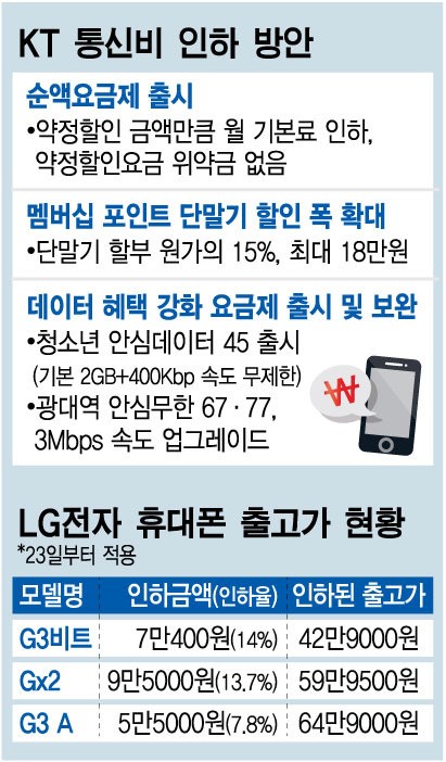 KT°¡ Áö³ 22ÀÏ 2³â ¾àÁ¤ À§¾à±ÝÀ» ¾ø¾Ø ¼ø¾× ¿ä±ÝÁ¦ µµÀÔÀ» °ñÀÚ·Î ÇÑ Åë½Åºñ ÀÎÇÏ ¹æ¾ÈÀ» ³»³ù´Ù. LGÀüÀÚµµ °°Àº ³¯ ½º¸¶Æ®Æù 3Á¾ÀÇ Ãâ°í°¡¸¦ ³»·È´Ù.