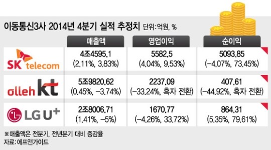 12ÀÏ »óÀå±â¾÷ºÐ¼®¾÷üÀÎ ¿¡ÇÁ¾Ø°¡À̵尡 9ÀÏ ±âÁØÀ¸·Î Áý°èÇÑ Áõ±Ç»çÀÇ ÃßÁ¤Ä¡¸¦ º¸¸é Åë½Å 3»çÀÇ Áö³ÇØ 4ºÐ±â ¿µ¾÷ÀÌÀÍÀº 9491¾ï¿øÀ¸·Î ÀüºÐ±â(1Á¶462¾ï¿ø) º¸´Ù 971¾ï¿ø ÁÙ¾îµé Àü¸ÁÀÌ´Ù. Àü³â µ¿±âÀÎ 2013³â 4ºÐ±â(4506¾ï¿ø)¿Í ºñ±³Çؼ´Â 4985¾ï¿ø ´õ ´Ã¾î³¯ Àü¸ÁÀÌ´Ù. ´ç½Ã KT°¡ 1840¾ï¿øÀÇ ÀûÀÚ¸¦ ±â·ÏÇØ ÀÌÅë3»çÀÇ ÃÑ ¿µ¾÷ÀÌÀÍ ±Ô¸ð°¡ Å©°Ô ÁÙ¾ú¾ú´Ù.