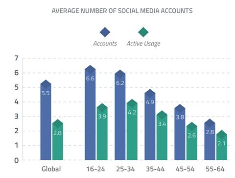 ÃÖ±Ù ¹Ì±¹ ½ÃÀåÁ¶»ç¾÷ü ±Û·Î¹úÀ¥À妽º´Â Áö³ÇØ 4ºÐ±â µ¿¾È 50°³ SNS Áß¿¡¼ Àü¼¼°è ¼ºÀÎ ÀÎÅÍ³Ý »ç¿ëÀÚµéÀÌ ¾ó¸¶³ª ¸¹Àº SNS°èÁ¤À» º¸À¯Çϰí ÀÖ°í, ¶Ç Àû±ØÀûÀ¸·Î »ç¿ëÇϰí ÀÖ´ÂÁö Á¶»ç°á°ú¸¦ ¹ßÇ¥Çß´Ù. Á¶»ç°á°ú, ÀÎÅÍ³Ý »ç¿ëÀÚ´Â Æò±ÕÀûÀ¸·Î 5.54°³ÀÇ °èÁ¤À» °®°í ÀÖÁö¸¸, ÀÌÁß Àû±ØÀûÀ¸·Î »ç¿ëÇÏ´Â SNS´Â 2.82°³·Î Á¶»çµÆ´Ù.