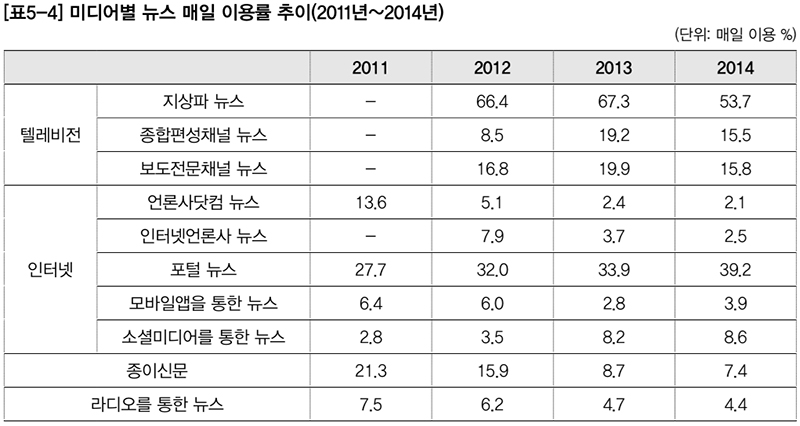 ¡®¹Ìµð¾îº° ´º½º ¸ÅÀÏ ÀÌ¿ë·ü ÃßÀÌ¡¯ Ç׸ñÀ» º¸¸é ÀÚ¼¼ÇÑ °á°ú¸¦ ¾Ë ¼ö ÀÖ½À´Ï´Ù. ÀüÅëÀûÀÎ ´º½º Àü´Þ ¸ÅüÀÎ Áö»óÆÄ¿Í º¸µµÀü¹®Ã¤³Î, ¾ð·Ð»ç´åÄÄ, ÀÎÅÍ³Ý ¾ð·Ð»ç µîÀº ¸ðµÎ ÀÌ¿ë·üÀÌ ´«¿¡ ¶ç°Ô ÁÙ¾îµé¾ú½À´Ï´Ù. 2013³â Áö»óÆÄÀÇ ´º½º¸¦ ¸ÅÀÏ ÀÌ¿ëÇϰí ÀÖ´Ù°í ´ë´äÇÑ À̵éÀº 67.3% ¿´´Âµ¥, 2014³â¿¡´Â 53.7%·Î ¶³¾îÁ³½À´Ï´Ù. º¸µµÀü¹®Ã¤³ÎÀÇ ´º½º¸¦ ¸ÅÀÏ º¸°í ÀÖ´Ù°í ´äÇÑ À̵鵵 2013³â 19.9%¿¡¼­ 2014³â 15.8%·Î ÁÙ¾îµé¾ú½À´Ï´Ù.
