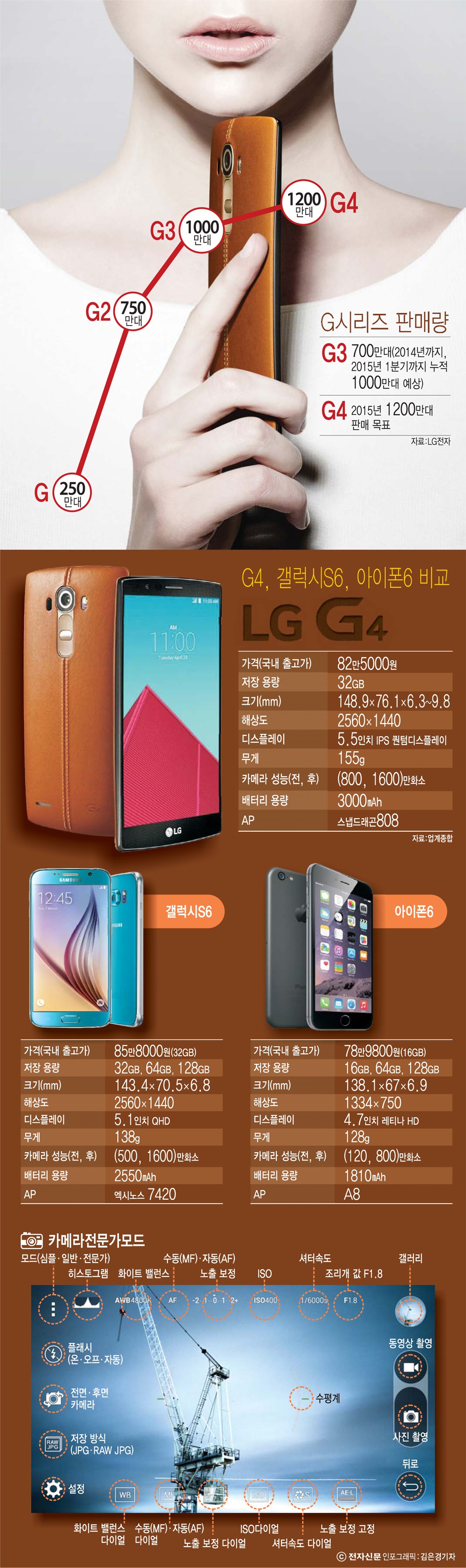 LGÀüÀÚ°¡ G4¸¦ Ãâ½ÃÇÏ¸ç °¶·°½ÃS6, ¾ÆÀÌÆù6¿Í Ä¡¿­ÇÑ °æÀïÀ» ¿¹°íÇß´Ù. G4´Â ¾ÆÀÌÆù6(16GB)º¸´Ù 3¸¸5000¿©¿ø ºñ½Î°í °¶·°½ÃS6(32GB)º¸´Ù 3¸¸3000¿ø Àú·ÅÇÏ´Ù. ¶Ç °¶·°½ÃS6, ¾ÆÀÌÆù6¿Í ºñ±³ÇØ µð½ºÇ÷¹À̰¡ Å©°í ¹èÅ͸® ¿ë·®°ú Ä«¸Þ¶ó ¼º´ÉÀÌ ³ô´Ù.