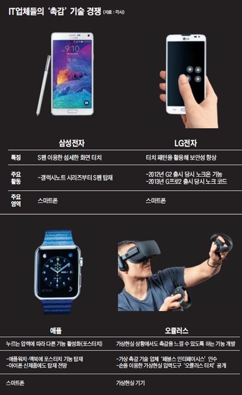 ¾ÆÀÌÆù¿¡µµ ºñ½ÁÇÑ ±â´ÉÀÌ Àû¿ëµÅ ȸéÀ» ÅåÅå µÎµå¸®¸é Ä«¸Þ¶ó°¡ ÄÑÁø´Ù°Å³ª ±æ°Ô ²Ú ´©¸£¸é ÀüÈ·Î ¿¬°áµÇ´Â °Í µîÀÌ °¡´ÉÇØÁú Àü¸ÁÀÌ´Ù. ÃÖ±Ù¿¡´Â ½º¸¶Æ®Æù»Ó ¾Æ´Ï¶ó °¡»óÇö½Ç(VR)À̳ª °ÔÀÓ ºÐ¾ß¿¡¼µµ ÅÍÄ¡ ±â¼ú(Touching tech)ÀÌ »õ·Î¿î °æÀï·ÂÀ¸·Î ÁÖ¸ñ¹Þ°í ÀÖ´Ù. ¾÷üµé¸¶´Ù ÅÍÄ¡ ±â¼úÀ» Áö´Ñ ±â¾÷À» ÀμöÇÕº´(M&A)ÇÏ¸ç ¿ª·®À» Ű¿ö³ª°¡°í ÀÖ´Ù.
