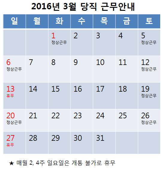 [2016³â 3¿ù ÁÖ¸» ¹× °øÈÞÀÏ ´çÁ÷±Ù¹« ¾È³»]