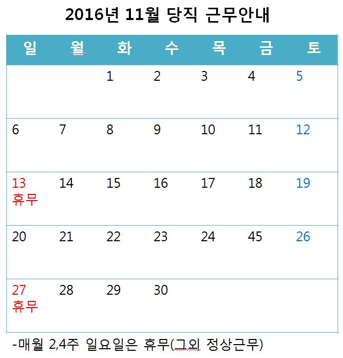 [2016³â 11¿ù ÁÖ¸» ¹× °øÈÞÀÏ ´çÁ÷±Ù¹« ¾È³»]