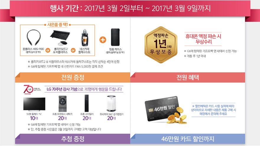 LG G6 ¿¹¾à°¡ÀÔÀ» ¾Æ·¡¿Í °°ÀÌ ÁøÇàÇÕ´Ï´Ù. ÃÖ»óÀÇ ±¸¸ÅÁ¶°Ç, À¯´Ï¿Â¸ð¹ÙÀÏ ¿¹¾à°¡ÀÔÀ¸·Î Ưº°ÇÑ ÇýÅñîÁö!