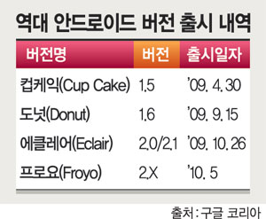 £§ÇÁ·Î¿ä£§´Â »ì¦ ¾ó¸° ¿ä°ÅÆ®(Frozen Yogert)¸¦ ÀǹÌÇÏ´Â ¸»·Î ±¸±ÛÀº ¾Èµå·ÎÀ̵å OS¿¡ ÄÅÄÉÀÌÅ©(1.5), µµ³Ó(1.6), ¿¡Å¬·¹¾î(2.0), ÇÁ·Î¿ä(2.X) µîÀÇ µðÀúÆ® À̸§À» º°ÄªÀ¸·Î ºÙ¿© ¿Ô´Ù.