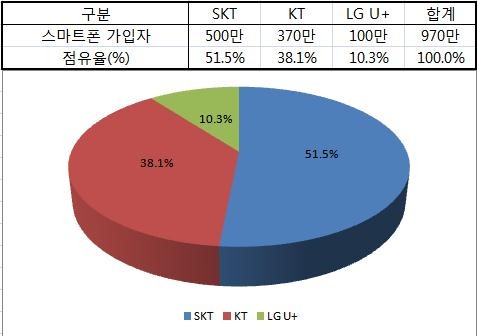 SKÅÚ·¹ÄÞ(ÀÌÇÏ SKT)°ú LGÀ¯Ç÷¯½º´Â ½º¸¶Æ®Æù °¡ÀÔÀÚ°¡ °¢°¢ 500¸¸ ¸í°ú 100¸¸ ¸íÀ» µ¹ÆÄÇß´Ù°í 14ÀÏ ¹àÇû´Ù. KTÀÇ ½º¸¶Æ®Æù °¡ÀÔÀÚµµ 13ÀÏÀ» ±âÁØÀ¸·Î 370¸¸ ¸í¿¡ ´ÞÇϱ⠶§¹®¿¡, Çö ½ÃÁ¡¿¡¼­ Åë½Å 3»ç¸¦ ÇÕÄ¡¸é ±¹³» ½º¸¶Æ®Æù ÀÌ¿ëÀÚ°¡ 970¸¸ ¸íÀ» ³Ñ¾î¼± ¼ÀÀÌ´Ù.