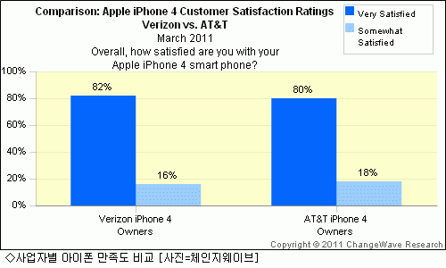 5ÀÏ(ÇöÁö½Ã°£) ¹Ì±¹ÀÇ ½ÃÀåÁ¶»ç±â°üÀΠüÀÎÁö¿þÀ̺갡 ¹ö¶óÀÌÁðÀÇ ¾ÆÀÌÆù4¿Í AT&T ÀÇ ¾ÆÀÌÆù4 »ç¿ëÀÚ 4õ98¸íÀ» »ó´ë·Î ¼ÒºñÀÚ ¸¸Á·µµ¿Í ÅëÈ ²÷±è Çö»óÀ» Á¶»çÇÑ °á°ú ¾ÆÀÌÆù¿¡ ´ëÇÑ ¸¸Á·µµ¿¡¼ º° Â÷À̰¡ ¾ø´Â °ÍÀ¸·Î ³ªÅ¸³µ´Ù.