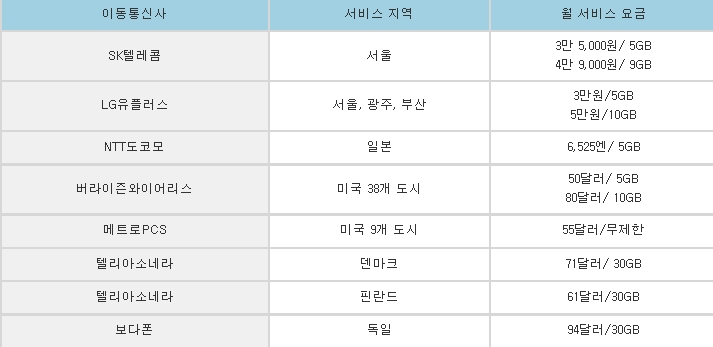 ÀϺ», ¿À½ºÆ®¸®¾Æ, µ§¸¶Å©, Çɶõµå, ½º¿þµ§, µ¶ÀÏ µî¿¡ µû¶ó Á¶±Ý¾¿ Â÷ÀÌ´Â ÀÖÁö¸¸ ±¹³»¿Í ºñ½ÁÇϰųª ¾à°£ ´õ Àú·ÅÇÑ ¼öÁØÀÌ´Ù. ¹°·Ð ÀÌµé ±¹°¡´Â LTE¸¦ ¸ÕÀú ¼­ºñ½ºÇϰí ÀÖ´Ù´Â Á¡Àº °í·ÁÇØ¾ß ÇÒ ºÎºÐÀÌ´Ù.