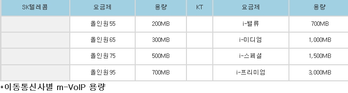½ºÄ«ÀÌÇÁ, ¹ÙÀ̹ö¿Í °°Àº m-VoIP¸¦ ¾ó¸¶³ª Áö¿øÇÏ´Â Áöµµ °ü°ÇÀÌ´Ù. ±âÁ¸ 3G ¹«Á¦ÇÑ µ¥ÀÌÅÍÀÇ °æ¿ì ¿ä±ÝÁ¦¿¡ µû¶ó 200¡­700MB Á¤µµÀÇ ¿ë·®À» Á¦°øÇÑ ¹Ù ÀÖ´Ù. 200MBÀÇ ¿ë·®Àº m-VoIP·Î ¾à 1,000ºÐ(16½Ã°£) Á¤µµÀÇ À½¼ºÅëÈ­°¡ °¡´ÉÇÏ´Ù. 700MBÀÇ °æ¿ì ¾à 3,500ºÐ(48½Ã°£)ÀÌ´Ù.