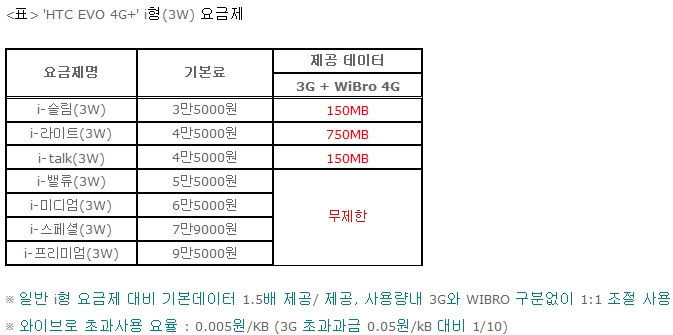 ¡®EVO 4G+¡¯¸¦ 5¸¸5000¿ø ÀÌ»ó £§iÇü(3W)£§ ¿ä±ÝÁ¦·Î ±¸¸ÅÇÏ´Â °í°´µéÀº 3G»Ó¸¸ ¾Æ´Ï¶ó Ãß°¡¿ä±Ý ¾øÀÌ ¿ÍÀ̺ê·Î 4Gµµ ¹«Á¦ÇÑ ÀÌ¿ëÇÒ ¼ö ÀÖ´Ù. 5¸¸5000¿ø ¹Ì¸¸ ¿ä±ÝÁ¦ °¡ÀÔ °í°´µéÀº ±âÁ¸ ¿ä±ÝÁ¦ º°·Î Á¦°øµÇ´Â 3G µ¥ÀÌÅÍ·®º¸´Ù 1.5¹è ¸¹Àº µ¥ÀÌÅ͸¦ ¿ÍÀ̺ê·Î4G¿Í ¹èºÐÇÏ¿© ÀÚÀ¯·Ó°Ô ÀÌ¿ëÇÒ ¼ö ÀÖ´Ù.