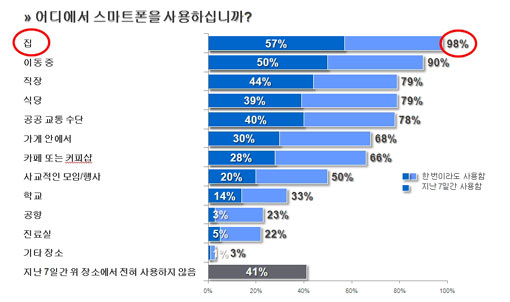 ±¸±ÛÀº 7ÀÏ ±Û·Î¹ú ¸¶ÄÏ ¸®¼Ä¡ ȸ»ç ÀÔ¼Ò½º(Ipsos)¿¡ ÀÇ·ÚÇØ Àü±¹ 1000¸íÀÇ ½º¸¶Æ®Æù »ç¿ëÀÚ¸¦ ´ë»óÀ¸·Î ÁøÇàÇÑ ¼³¹®Á¶»ç(º¹¼öÀÀ´ä °¡´É)¿¡¼ ¡®½º¸¶Æ®ÆùÀ» ¾îµð¿¡¼ »ç¿ëÇϽʴϱ¶ó´Â Áú¹®¿¡ ¡®Áý(98%)¡¯ÀÌ ¡®À̵¿ Áß(90%)¡¯º¸´Ù ´õ ¸¹ÀÌ ²ÅÈ÷¸ç °¡Àå ÁÖµÈ ½º¸¶Æ®Æù »ç¿ë Àå¼Ò·Î ³ªÅ¸³µ´Ù°í ¹àÇû´Ù.