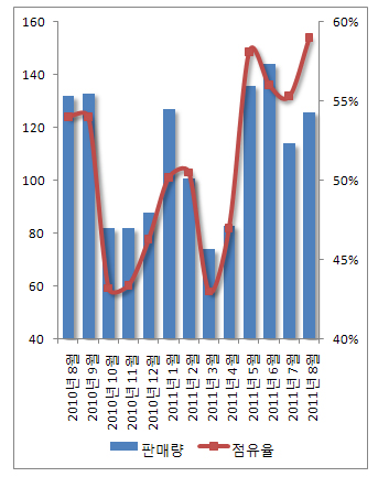 »ï¼ºÀüÀÚ°¡ Áö³­´Þ ±¹³» ½ÃÀå¿¡¼­ 126¸¸´ëÀÇ ÈÞ´ëÆùÀ» ÆÈ¾Æ ½ÃÀå Á¡À¯À² 59%¸¦ ´Þ¼ºÇß´Ù. ÀÌ´Â »ï¼ºÀüÀÚ°¡ ÈÞ´ëÆù ½ÃÀåÁ¡À¯À² Áý°è¸¦ ½ÃÀÛÇÑ Áö³­ 2008³â ÀÌ·¡ ÃÖ°íÄ¡´Ù.