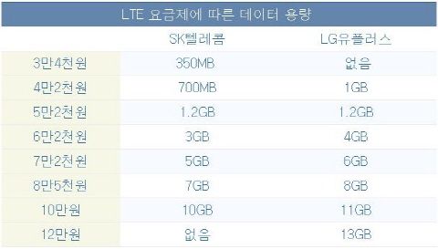 ¿ù ¿ä±Ýº° LTE µ¥ÀÌÅÍ ¿ë·®À» º¸¸é ¡ã3¸¸¿ø´ë´Â ¾ø°í ¡ã4¸¸2õ¿ø 1GB ¡ã5¸¸2õ¿ø 1.2GB·Î ³ª´¶´Ù. 5¸¸2õ¿øÀº SKÅÚ·¹ÄÞ°ú °°Àº ¿ë·®ÀÌÁö¸¸ 4¸¸2õ¿øÀº 300MB ´õ ¸¹´Ù.
