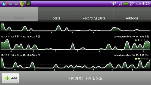 ¡®½½¸³ ¾ÖÁî ¾Èµå·ÎÀ̵塯(Sleep-as-an-Droid)´Â ÀÌ·± ÃëħÀÚÀÇ ¼ö¸é»óŸ¦ ÆÄ¾ÇÇÒ ¼ö ÀÖ°Ô µµ¿ÍÁÖ´Â ¾ÛÀÌ´Ù. ÀáÀÚ¸® ¸Ó¸® ¸Ã¿¡ ÀÌ ¾ÛÀ» ½ÇÇàÇϰí ÀáÀÌ µé¸é, ½º¸¶Æ®ÆùÀ» ÅëÇØ Áøµ¿°ú ¼Ò¸®¸¦ ¼öÁýÇÑ´Ù. ÀÌ Áøµ¿°ú ¼Ò¸®¸¦ ¹ÙÅÁÀ¸·Î ¹ã»õ ÃëħÀÚ°¡ ¾î¶»°Ô ÀáÀ» ÀÚ´ÂÁö¸¦ ±×·¡ÇÁ·Î ±×·Á¼­ º¸¿©ÁØ´Ù. ¹ã»õ ¾ó¸¶³ª µÚô¿´´ÂÁö ÆÄ¾ÇÇÒ ¼ö ÀÖÀ¸¸ç ¾ðÁ¦ ÀáÀÌ µé¾î¾ß ÀûÀýÇÒ Áö ¾Ë·ÁÁØ´Ù.