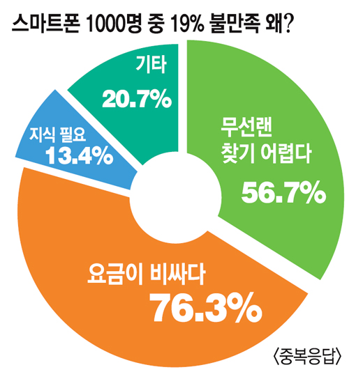 Áߺ¹ ¼±ÅÃÀ» Çã¿ëÇÑ ½º¸¶Æ®ÆùÀÇ ºÒ¸¸Á· ÀÌÀ¯¿¡ ´ëÇÑ Áú¹®¿¡´Â ÀüüÀÇ 76.3%°¡ Ȱ¿ëµµ¿Í ºñ±³ÇØ ºñ½Ñ ¿ä±ÝÁ¦¸¦ ²Å¾Ò´Ù. ¹«¼±·£(¿ÍÀÌÆÄÀÌ; Wi-Fi) Áö¿ªÀÌ Àû´Ù´Â ºÒ¸¸µµ 56.7%·Î ³ôÀº ¼öÁØÀ̾ú´Ù.