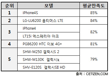 ½º¸¶Æ®Æù ¸¸Á·µµ¿¡¼ 1À§´Â ¾ÆÀÌÆù4S(¾ÖÇÃ), 2À§´Â ¿ÉƼ¸Ó½º LTE(LGÀüÀÚ)°¡ Â÷ÁöÇßÀ¸¸ç ¾ÆÀÌÆù4(¾ÖÇÃ), ¿¢½ºÆä¸®¾Æ ¾ÆÅ©(¼Ò´Ï), À̺¸4G+(HTC), °¶·°½ÃS2(»ï¼ºÀüÀÚ)°¡ ±× µÚ¸¦ À̾ú´Ù.