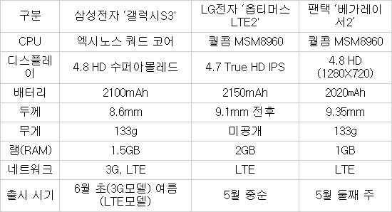 °¡Àå ¸ÕÀú ½ÃÀå¿¡ ³ª¿À´Â Á¦Ç°Àº ÆÒÅà `º£°¡·¹À̼­2`·Î 5¿ù µÑ° ÁÖ¿¡, LGÀüÀÚ `¿ÉƼ¸Ó½º LTE2`´Â Áß¼ø Åë½Å3»ç¿¡¼­ Ãâ½ÃµÈ´Ù. »ï¼ºÀüÀÚ °¶·°½ÃS3´Â 6¿ù SKÅÚ·¹ÄÞ¿¡¼­ 3G¸ðµ¨·Î ¸ÕÀú ³ª¿Â ÈÄ ¿©¸§²² LTE¸ðµ¨ÀÌ ³ª¿Ã ¿¹Á¤ÀÌ´Ù.