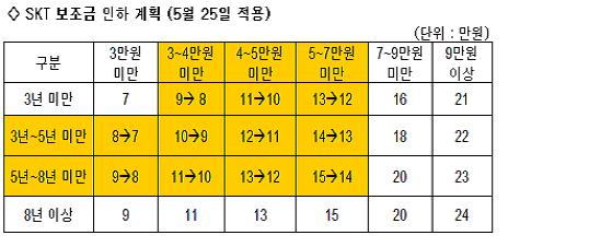 SKÅÚ·¹ÄÞÀº 6°³¿ù Æò±Õ¿ä±ÝÀÌ 3¸¸¿ø ¹Ì¸¸ÀÌ¸é¼ »ç¿ë±â°£ÀÌ 3~8³â »çÀÌ¿¡ ÀÖ´Â °¡ÀÔÀÚ, 3¸¸~7¸¸¿ø »çÀÌÀÇ 8³â ¹Ì¸¸ »ç¿ëÀÚÀÇ ÈÞ´ëÆù º¸Á¶±ÝÀ» 25ÀϺÎÅÍ °¢°¢ 1¸¸¿ø¾¿ ÀÎÇÏÇÑ´Ù°í 16ÀÏ ¹àÇû´Ù.