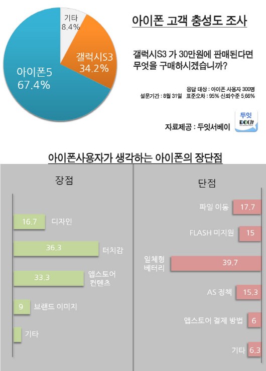 ¼³¹®Á¶»ç¾÷ü µÎÀÕ¼º£À̰¡ Áö³´Þ 31ÀÏ ¾ÆÀÌÆù »ç¿ëÀÚ 300¸íÀ» ´ë»óÀ¸·Î ¼³¹®Á¶»ç ÇÑ °á°ú °¶·°½ÃS3 ÆÇ¸Å°¡°¡ 30¸¸¿øÀÌ µÇ´õ¶óµµ ¾ÆÀÌÆù »ç¿ëÀÚÀÇ 67.4%´Â ¾ÆÀÌÆù5¸¦ ±¸¸ÅÇÒ ÀÇÇâÀÌ ÀÖ´Â °ÍÀ¸·Î Á¶»çµÆ´Ù. À̰°Àº °á°ú°¡ ´õ¿í ³î¶ó¿î ÀÌÀ¯´Â °¶·°½ÃS3 ÆÇ¸Å°¡¿¡ ´ëÇÑ º¯È ¾øÀ̵µ 67.5%°¡ ¾ÆÀÌÆùÀ» ±¸¸ÅÇϰڴٰí ÀÀ´äÇ߱⠶§¹®ÀÌ´Ù. ¾ÆÀÌÆù »ç¿ëÀÚµéÀÌ »ý°¢ÇÏ´Â ¾ÆÀÌÆùÀÇ ÀåÁ¡À¸·Î´Â £§ÅÍÄ¡°¨£§(36.3%) £§¸¹Àº ¾Û½ºÅä¾î ÄÁÅÙÃ÷£§(33.3%)¸¦ ²Å°í ÀÖÀ¸¸ç, ´ÜÁ¡À¸·Î´Â £§ÀÏüÇü º£Å͸®£§(39.7%)¿Í £§ÆÄÀÏ ¿Å±â±â£§(17.7%) ¼øÀ¸·Î ³ª¿Ô´Ù.