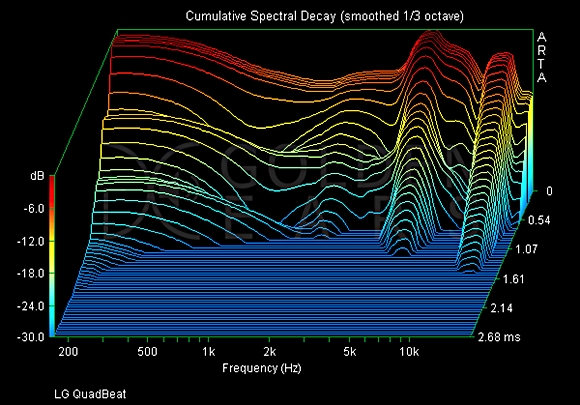 ÀÌ·± Ư¡Àº Á֯ļö ÀÀ´äƯ¼º(Cumulative Spectral decay, CSD) ÃøÁ¤¿¡¼­µµ Àß ³ªÅ¸³­´Ù. Á֯ļö ÀÀ´äƯ¼ºÀ̶õ ½ºÇÇÄ¿³ª À̾îÆùÀÌ Ãâ·ÂÇÏ´Â ¼Ò¸®°¡ Àΰ£ÀÇ °¡Ã» ´ë¿ª Á֯ļöÀÎ 20Hz~22KHz ¹üÀ§ ³»¿¡¼­ ¾ó¸¶¸¸Å­ÀÇ À½·®À¸·Î Ãâ·ÂµÇ´ÂÁö¸¦ ÃøÁ¤ÇÑ °ªÀ» ¸»ÇÑ´Ù. ÃøÁ¤¿¡´Â À½Çâ±â±â Àü¹® »çÀÌÆ®ÀÎ £§°ñµçÀ̾£§ÀÇ Àåºñ¸¦ ÀÌ¿ëÇß´Ù.