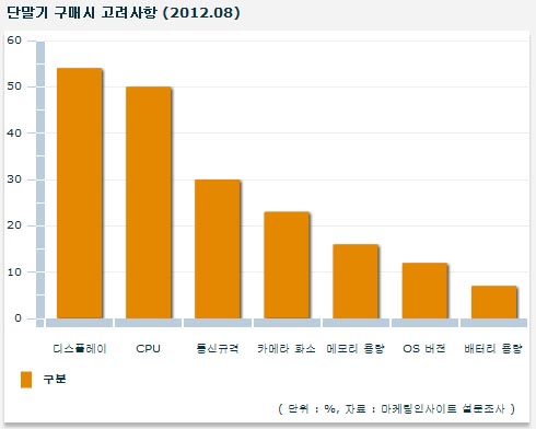 ÇÏÁö¸¸ °á°ú¸¦ ÀÚ¼¼È÷ µé¿©´Ùº¸¸é Àç¹ÌÀÖ´Â »ç½ÇÀ» ¹ß°ßÇÒ ¼ö ÀÖ´Ù. ¡®¹«¾ùÀ» ¼º´É/½ºÆåÀÇ ±âÁØÀ¸·Î »ï¾Ò´Â°¡¡¯¶ó´Â Áú¹®(º¹¼öÀÀ´ä ±âÁØ)¿¡ 54%¿¡ À̸£´Â »ç¶÷ÀÌ ¡®µð½ºÇ÷¹ÀÌ/¾×Á¤ ÇØ»óµµ¡¯¶ó°í ´äÇÑ °Í. ¡®CPU(¾ÖÇø®ÄÉÀÌ¼Ç ÇÁ·Î¼¼¼­)¡¯¸¦ ²ÅÀº »ç¶÷Àº 50%·Î 4% ³·¾Ò´Ù. °á±¹ ¼ÒºñÀÚ´Â ÇØ»óµµ°¡ ³ôÀº È­¸éÀ» ¾´ ´ëÇü ½º¸¶Æ®ÆùÀϼö·Ï ¼º´ÉÀÌ ¶Ù¾î³¯ °ÍÀ̶ó°í ±â´ëÇÑ´Ù´Â °É ¾Ë ¼ö ÀÖ´Ù.