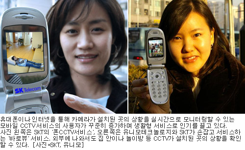 SKÅÚ·¹ÄÞÀº Áý ¾È¿¡ Ä«¸Þ¶ó¸¦ ¼³Ä¡ÇØ ¿ÜºÎ¿¡¼­µµ ÈÞ´ëÆùÀ» ÅëÇØ Áý¾È »óŸ¦ È®ÀÎÇÒ ¼ö ÀÖ´Â £§ÆùCCTV£§ ¼­ºñ½º¸¦ 2004³âºÎÅÍ Á¦°øÇϰí ÀÖ´Ù. ¹«Àü±â ¹× CCTV Àü¹®¾÷ü À¯´Ï¸ðÅ×Å©³î·ÎÁöµµ Áö³­ÇØ ¸» SKÅÚ·¹ÄÞ°ú ¼ÕÀâ°í £§¹Ù·Îºä£§ ¼­ºñ½º¸¦ ½ÃÀÛÇØ °¡ÀÔÀÚ¸¦ ²ÙÁØÈ÷ ´Ã·Á°¡°í ÀÖ´Ù.