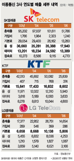 ¶Ç KTF¡¤LGÅÚ·¹ÄÞÀº ¸Å³â Àüü ¸ÅÃâÀÇ 18¡22%ÀÇ ¼öÀÍÀ» Á¢¼Ó·á¿¡¼ ³»°í ÀÖ´Â ¹Ý¸é, SKÅÚ·¹ÄÞÀÇ Á¢¼Ó·á ±â¿©µµ´Â Àüü ¸ÅÃâÀÇ 9% ¼öÁØ¿¡ ±×Ä£´Ù.