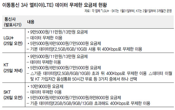 À̵¿Åë½Å 3»ç°¡ ÀÏÁ¦È÷ µ¥ÀÌÅÍ ¹«Á¦ÇÑ ¿¤Æ¼ÀÌ(LTE) ¿ä±ÝÁ¦¸¦ ³»³õ°í ¸¶ÄÉÆÃ °æÀï¿¡ ³ª¼¹´Ù. ÀÏ´Ü ÀÌ¿ëÀÚµéÀÇ ¼±ÅÃÀÇ ÆøÀÌ ³Ð¾îÁø´Ù´Â Á¡¿¡¼ ±àÁ¤ÀûÀÌÁö¸¸, µ¥ÀÌÅÍ Æ®·¡ÇÈ ±ÞÁõ°ú ¡®°í°¡ ½º¸¶Æ®Æù °øÂ¥¡¯ ÇüÅÂÀÇ ´«°¡¸²½Ä ¸¶ÄÉÆÃ¿¡ µû¸¥ ¼ÒºñÀÚ Åë½Åºñ ºÎ´ã Áõ°¡ µî ¿ì·ÁÀÇ ¸ñ¼Ò¸®µµ ³ª¿Â´Ù.