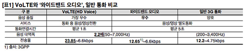 µÎ ±â¼úÀº ´à±âµµ, ´àÁö ¾Ê±âµµ Çß´Ù. °øÅëÁ¡Àº AMR-WB ¿Àµð¿À ÄÚµ¦À» ¾´´Ù´Â Á¡ÀÌ´Ù. ÀÛÀº ¿ë·®¿¡µµ ÃÖ´ëÇÑ ÁÁÀº ¼Ò¸®¸¦ ³»±â À§ÇÑ ¾ÐÃà ¹æ½ÄÀÌ´Ù. ±×·¡¼­ ¼Ò¸®¸¦ ´ãÀ» ¼ö ÀÖ´Â Á֯ļö ´ë¿ªÆøÀº VoLTE¿Í ¶È°°ÀÌ 50~7000Hz´Ù. ÀÏ¹Ý 3GÅëÈ­°¡ 200~3400Hz Á¤µµ¸¦ ´ã±â ¶§¹®¿¡ Åë½Å»çµéÀº 2.2¹è ±ú²ýÇÑ ¼Ò¸®¸¦ µé·ÁÁØ´Ù°í ¸»ÇÑ´Ù. ÇÏÁö¸¸ À½ÁúÀ» °áÁ¤ÇÏ´Â ¶Ç ÇϳªÀÇ ¿ä¼ÒÀÎ Àü¼Û·üÀº ÃÖ´ë 12kbps ¼öÁØÀ¸·Î 3G¿Í ¶È°°´Ù. VoLTE´Â À̺¸´Ù 2¹è Á¤µµ ³ôÀº 23.85kbps±îÁö ³½´Ù. ¾ÆÀÌÆù5¿¡ µé¾î°¡´Â ¿ÍÀ̵å¹êµå ¿Àµð¿À´Â Á֯ļö ´ë¿ªÆøÀº VoLTE±Þ, µ¥ÀÌÅÍ Àü¼Û·üÀº 3G ÅëÈ­±ÞÀ¸·Î ÀÌ·ïÁö´Â ¼ÀÀÌ´Ù.