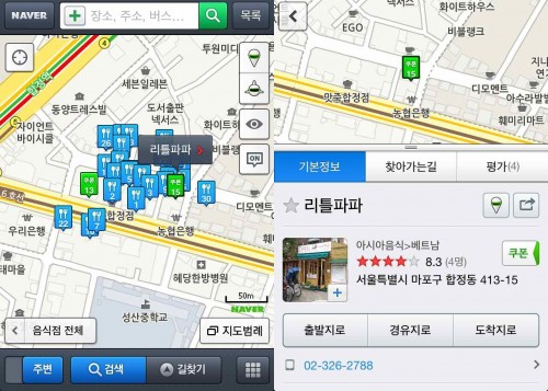 ÀÌ ±â´ÉÀº µüÈ÷ °¥ ¸¸ÇÑ À½½ÄÁ¡À̳ª ÂþÁýÀ» ¸ð¸¦ ¶§ À¯¿ëÇÏ´Ù. ÀÌ ±â´ÉÀ» Ȱ¼ºÈ­ÇÏ¸é ÆÄ¶õ ´ÜÃß°¡ Áöµµ¿¡ ³ªÅ¸³ª´Âµ¥ ´ÜÃ߸¦ ´©¸£¸é À½½ÄÁ¡ À̸§°ú ´ëÇ¥ ¸Þ´º, °¡°Ý, ÀüÈ­¹øÈ£ µîÀÌ ³ª¿Â´Ù. ¼öµµ±ÇÀ» Áß½ÉÀ¸·Î Àü±¹ 5507°³ »óÁ¡ÀÌ µî·ÏÇÑ ÄíÆù 5683ÀåÀ» ¾µ ¼ö ÀÖ´Ù. ÀÌÁß 10% ÇÒÀÎ, ÄíÆù º¸¿©ÁÖ¸é »ø·¯µå ¹«·á, µµÀå 5¹ø ÂïÀ¸¸é ¾Æ¸Þ¸®Ä«³ë ¹«·á¿Í °°Àº ÇýÅÃÀ» Á¦°øÇÏ´Â °÷µµ ÀÖ´Ù. ±×·± °¡°Ô´Â ´Ù¸¥ »óÁ¡°ú ´Ù¸£°Ô ÃÊ·Ï»öÀ¸·Î Ç¥½ÃµÈ´Ù. ¾îÂ÷ÇÇ °¥ °÷ ¸ø Á¤Çß´Ù¸é ÇÒÀÎÇØ Áְųª ÇÑ ±×¸© ´õ ÁÖ´Â µ¥°¡ ²ø¸®Áö ¾Ê°Ú´Â°¡.