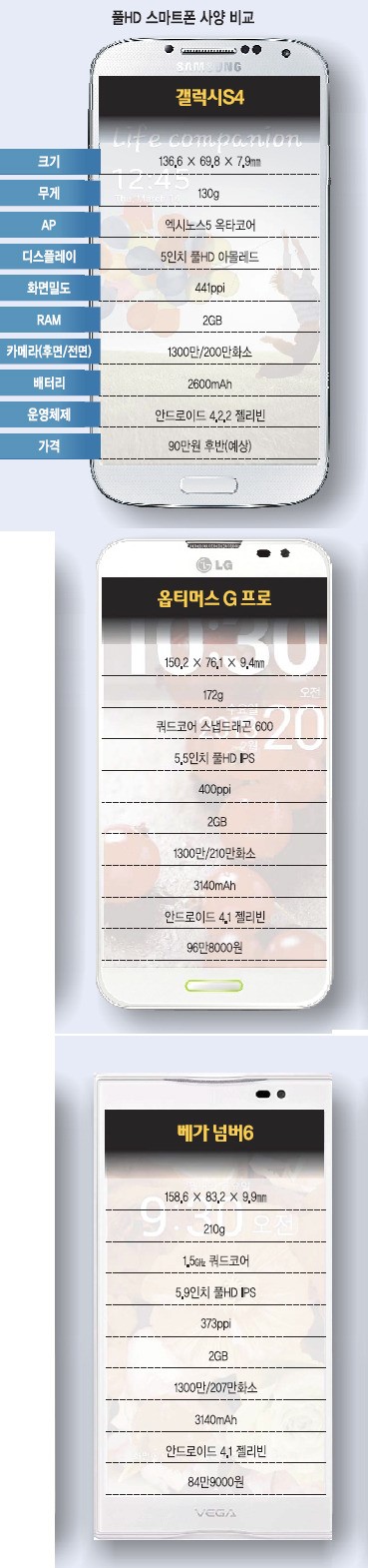 ÃÖ±Ù °¢ Á¦Á¶»ç°¡ ³»³õÀº Ç÷¡±×½Ê Á¦Ç°µéÀº »ç¾çÀÌ Å« Â÷ÀÌ ¾øÀÌ ¾ùºñ½ÁÇÏ´Ù. ÄõµåÄÚ¾î ¾îÇø®ÄÉÀÌ¼Ç ÇÁ·Î¼¼¼­(AP), 2GB ¸Þ¸ð¸®, Ç®HD(1920¡¿1080) µð½ºÇ÷¹ÀÌ, 1300¸¸ È­¼Ò Ä«¸Þ¶ó µîÀÌ °øÅë »ç¾çÀ¸·Î žÀçµÅ ÀÖ´Ù. ÀÌ·¸´Ùº¸´Ï Á¦Á¶»çµéÀº Àú¸¶´Ù ÀڽۨÀ» ³»ºñÄ¡°í ÀÖ´Ù. ¾Õ¼­°¡´Â »ï¼ºÀüÀÚ´Â ºê·£µå ÆÄ¿ö¸¦ ¹ÙÅÁÀ¸·Î °¶·°½ÃS4¸¦ ÅëÇØ °æÀïÀÚµéÀ» ¸ÖÂġ µûµ¹¸®°Ú´Ù´Â ż¼´Ù. ¹Ý¸é LG¿Í ÆÒÅà µî ÈĹßÁÖÀÚ µîÀº µ¿µîÇÑ »ç¾çÀ» ³»¼¼¿ö À̹ø ±âȸ¿¡ »ï¼ºÀüÀÚ¸¦ µû¶óÀâ°Ú´Ù´Â ½É»êÀÌ´Ù.