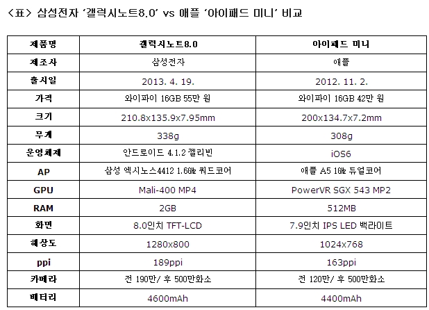 µð½ºÇ÷¹ÀÌ´Â Å« Â÷À̰¡ ¹ú¾îÁöÁö´Â ¾ÊÁö¸¸ ¡®°¶·°½Ã³ëÆ®8.0¡¯ÀÌ ¼ÒÆø ¾Õ¼±´Ù. 8ÀÎÄ¡ Å©±â·Î 1280x800 ÇØ»óµµ, 189ppiÀÇ ¼±¸íµµ¸¦ º¸ÀδÙ. ¡®¾ÆÀÌÆÐµå ¹Ì´Ï¡¯´Â 1024x768 ÇØ»óµµ, 163ppi´Ù. Å©±â´Â 7.9ÀÎÄ¡·Î ¡®°¶·°½Ã³ëÆ®8.0¡¯°ú´Â 0.1ÀÎÄ¡ Â÷ÀÌ´Ù.