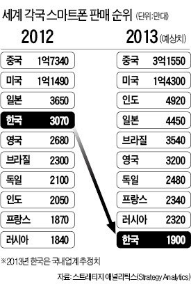 ¹Ì±¹ ½ÃÀåÁ¶»ç¾÷ü ½ºÆ®·¡Æ¼Áö¾Ö³Î¸®Æ½½º(SA)¿¡ µû¸£¸é Áö³ÇØ Çѱ¹ ½º¸¶Æ®Æù ÆÇ¸Å·®Àº 3070¸¸´ë¿´´Ù. Áß±¹ ¹Ì±¹ ÀϺ»¿¡ ÀÌ¾î ¼¼°è 4À§ ±Ô¸ð´Ù. SA´Â ¿ÃÇØ Çѱ¹ ÆÇ¸Å·®Àº 2630¸¸´ë·Î ÁÙ¾î 7À§·Î ¶³¾îÁú °ÍÀ¸·Î Áö³ 9¿ù ³»´ÙºÃ´Ù.
