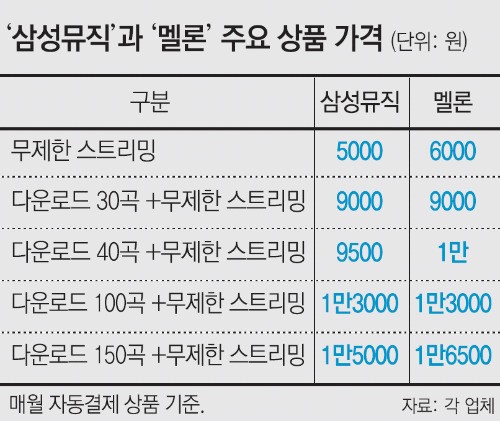 »ï¼ºÀüÀÚ°¡ ±âÁ¸ À½¿ø ¼­ºñ½º¿Í °¡Àå Â÷º°È­ÇÏ´Â ºÎºÐÀº ÆÄ°ÝÀûÀÎ °¡°ÝÀÌ´Ù. °æÀï»çº¸´Ù ¿ù 500¿ø¿¡¼­ ÃÖ´ë 2500¿ø±îÁö ½Î°Ô °¡°ÝÀ» Ã¥Á¤ÇØ ¼­ºñ½º °³½Ã ÃʱâºÎÅÍ À̿밴À» ´ë°Å È®º¸ÇÒ ¹æÄ§ÀÌ´Ù. »ï¼º ¹ÂÁ÷Àº ¹«Á¦ÇÑ ½ºÆ®¸®¹Ö »óǰ(ÀÚµ¿°áÁ¦ ±âÁØ ¿ù 5000¿ø)°ú ´õºÒ¾î ´Ù¿î·Îµå Àü¿ëÀ¸·Î ÀÌ¿ëÇÒ ¼ö ÀÖ´Â »óǰ 4Á¾(¡¨ ¿ù 6000¡­1¸¸3000¿ø), ¹«Á¦ÇÑ ½ºÆ®¸®¹Ö°ú ´Ù¿î·Îµå¸¦ ÇÔ²² ÀÌ¿ëÇÒ ¼ö ÀÖ´Â º¹ÇÕ»óǰ 4Á¾(¡¨ ¿ù 9000¡­1¸¸5000¿ø)À» Á¦°øÇÑ´Ù.