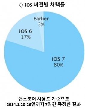 ¾ÖÇÃÀº À̳¯ ¾Û½ºÅä¾î »ç¿ëµµ¿¡ ±â¹ÝÇÑ ÃøÁ¤ °á°ú¸¦ Åä´ë·Î ¾ÖÇà ±â±âÀÇ 80%¿¡ iOS7ÀÌ Àû¿ëµÆ´Ù°í ¹àÇû´Ù. ¹Ý¸é ÀÌÀü ¹öÀüÀÎ iOS6ÀÇ Ã¤Å÷üÀº 17%·Î Ç϶ôÇß´Ù.