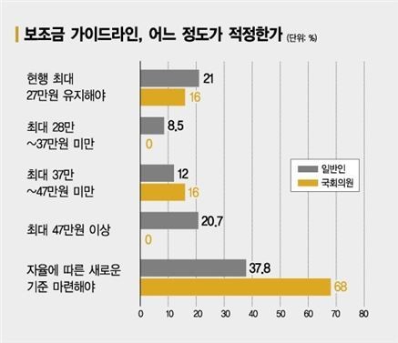Áö±ÝÀÇ º¸Á¶±Ý ¼öÁØÀ» Á¶Á¤ÇÒ Çʿ䰡 ÀÖ´Ù´Â µ¥´Â ÀÇ¿øµéµµ µ¿ÀÇÇß´Ù. ÃÖ´ë 27¸¸¿øÀÇ Çö ¼öÁØÀ» À¯ÁöÇØ¾ß ÇÑ´Ù´Â ´äÀº 3¸í¿¡ ±×ÃÆ°í, ³ª¸ÓÁö 16¸í(84%)Àº °¡À̵å¶óÀÎÀ» ÀλóÇϰųª ¿ÏÀüÈ÷ »õ·Î¿î ±âÁØÀ» ¸¶·ÃÇÏÀÚ°í ´äÇß´Ù. ¿©´ç CÀÇ¿øÀº £¢Á¤ºÎ°¡ »õ·Î¿î °¡À̵å¶óÀÎ »êÁ¤À» À§ÇØ ¼¼ºÎÀû ¹æ¾ÈÀ» °ËÅäÇÏ´Â »óȲÀÎ ¸¸Å, ÀÌÅë»ç¿Í ¼ÒºñÀÚ´Üü µî°ú ±ä¹ÐÇÑ ÇùÀǸ¦ °ÅÃÄ ÀûÁ¤ ¼öÁØÀ» Á¦½ÃÇÏ´Â °ÍÀÌ ¹Ù¶÷Á÷ÇÏ´Ù£¢°í ¸»Çß´Ù. ¾ß´ç DÀÇ¿øÀº £¢¿À´Ã³¯ ½º¸¶Æ®Æù ½ÃÀå ȯ°æ º¯È¿¡ ¸Â°Ô Á¤±³ÇÑ ºÐ¼®°ú °ËÅ並 °ÅÃÄ ¼öÁØÀ» º¯°æÇÒ Çʿ䰡 ÀÖ´Ù£¢¸é¼ £¢¸ÅÃâ¾×, ¼ÒºñÀÚ ºÎ´ã µîÀ» °í·ÁÇϰí ÀÌÅë»çÀÇ ¿ø°¡ µîµµ ´Ù¹æ¸éÀ¸·Î ºÐ¼®ÇÑ ÈÄ Á¤ÇÏÀÚ£¢´Â ÀǰßÀ» Á¦½ÃÇß´Ù.