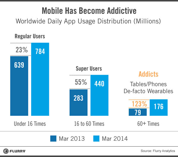 ¹Ì±¹ ¸ð¹ÙÀÏ ºÐ¼® ¾÷ü ¡®Ç÷¯¸®(Flurry)¡¯°¡ 22ÀÏ ¸ð¹ÙÀÏ Áßµ¶ º¸°í¼¸¦ ³»³ù½À´Ï´Ù. Á¦¸ñÀº ¡®¸ð¹ÙÀÏ Áßµ¶ÀÇ µîÀå (The Rise of the Mobile Addict)¡¯. »ç¶÷µéÀº ÇÏ·ç 10¹øÂë ¸ð¹ÙÀÏ ¾Û(ÀÀ¿ë ÇÁ·Î±×·¥)À» ½ÇÇàÇÑ´Ù°í ÇÕ´Ï´Ù. Ç÷¯¸®´Â ÇÏ·ç 60¹ø ÀÌ»ó, ±×·¯´Ï±î Æò±ÕÀÇ 6¹è ÀÌ»ó ¾ÛÀ» ½ÇÇàÇÏ´Â °ÍÀ» ¡®¸ð¹ÙÀÏ Áßµ¶£§À̶ó°í Á¤ÀÇÇß½À´Ï´Ù. º¸°í¼ ³»¿ë. À̹ø Á¶»ç´Â 3¿ù Áß ¸ð¹ÙÀÏ ±â±â 13¾ï´ë¿¡¼ 50¸¸°³ ¾ÛÀ» ´ë»óÀ¸·Î ÁøÇàÇß´Ù. ÀÛ³â 3¿ù Á¶»ç °á°ú¿Í ºñ±³ÇÏ¸é ¸ð¹ÙÀÏ Áßµ¶ÀÌ 123% ±ÞÁõÇß´Ù. ¸ð¹ÙÀÏ Áßµ¶ÀÚ°¡ 7900¸¸¸í¿¡¼ 1¾ï7600¸¸¸íÀ¸·Î ´Ã¾ú´Ù. Á÷Àü ´Ü°èÀÎ °ú´Ù»ç¿ëÀÚ(ÇÏ·ç 16~60ȸ)´Â 55% Áõ°¡Çß°í, º¸Åë»ç¿ëÀÚ(ÇÏ·ç 10ȸ ¹Ì¸¸)´Â 23% Áõ°¡Çß´Ù.