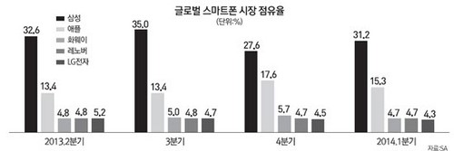 ¶Ç ´Ù¸¥ ½ÃÀåÁ¶»ç±â°üÀÎ IDCÀÇ ±Û·Î¹ú ½º¸¶Æ®Æù ½ÃÀåÁ¡À¯À²¿¡¼­µµ Áö³­ÇØ 3ºÐ±âºÎÅÍ 5À§·Î Ãß¶ôÇß´Ù. »ï¼ºÀüÀÚ¿Í ¾ÖÇÃÀ» °æÀïÀÚ·Î ¿©°Ü¿Ô´ø LGÀüÀÚ°¡ ÇÁ¸®¹Ì¾ö ½ÃÀå¿¡¼­´Â »ï¼º°ú ¾ÖÇÿ¡ µÚÁö°í, ÁßÀú°¡¿¡¼­´Â Áß±¹ °ø¼¼¿¡ ¹Ð¸®°í ÀÖ´Â ¼ÀÀÌ´Ù.