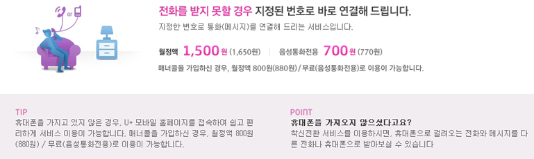 ¾Æ·¡ À̹ÌÁö¸¦ Ŭ¸¯ÇϽøé È®´ëÇØ¼ º¸½Ç¼ö ÀÖ½À´Ï´Ù. ¾Æ·¡ LGU+ ÁÖ¼Ò ÂüÁ¶Çϼŵµ µË´Ï´Ù.(http://www.uplus.co.kr/css/pord/cosv/cosv/RetrievePsMbSDmsgInfo.hpi?catgCd=50301&prodCdKey=C000000101)